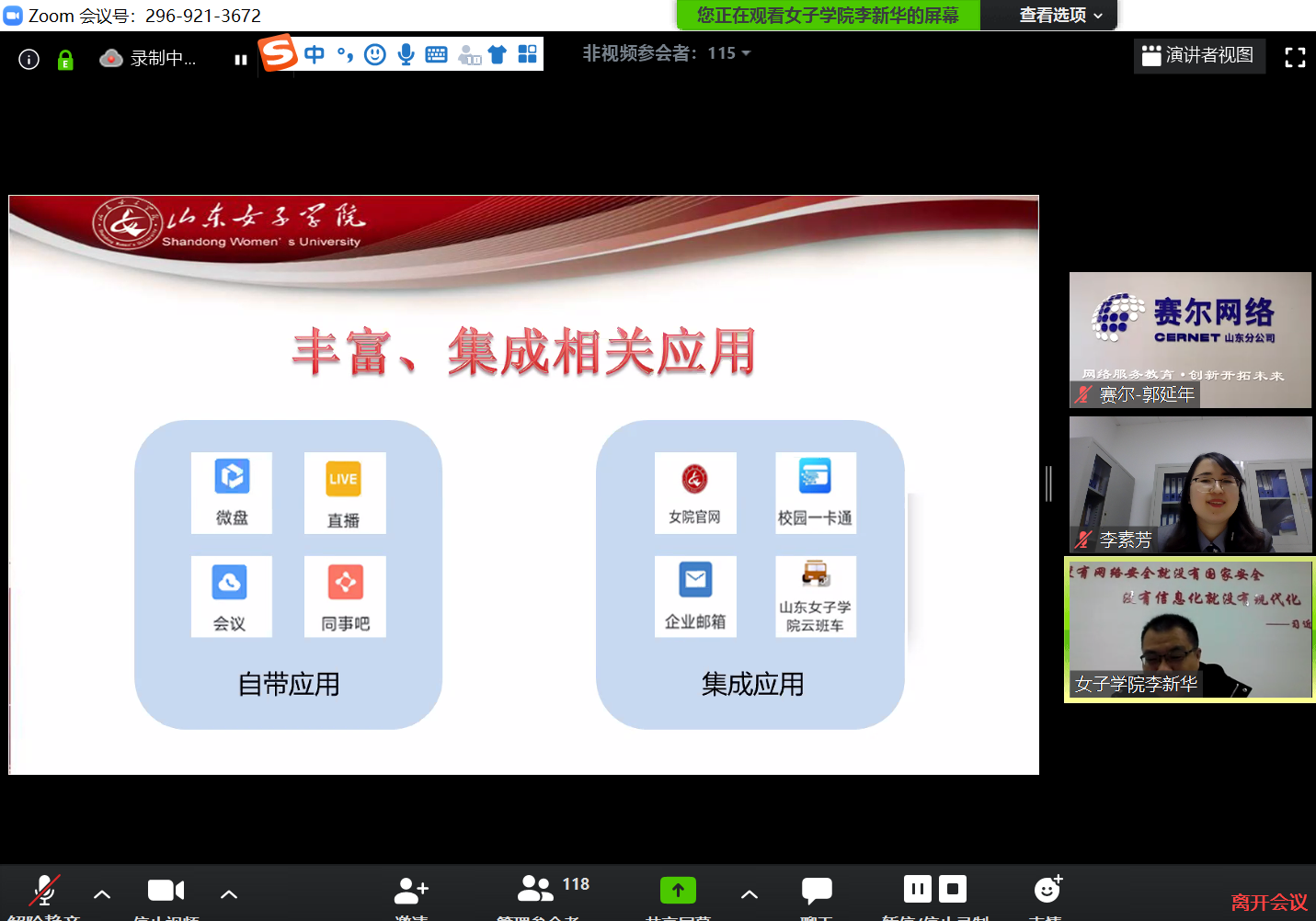 3月26日上午,赛尔网络有限公司山东分公司组织举办第三期教育网线上沙龙活动。本次活动邀请山东建筑大学、山东女子学院、山东理工大学信息化主管部门负责人进行主题交流发言,我校网络信息中心全体人员同来自全省高校信息化相关部门的130多名人员一起通过ZOOM视频会议参加了此次活动。