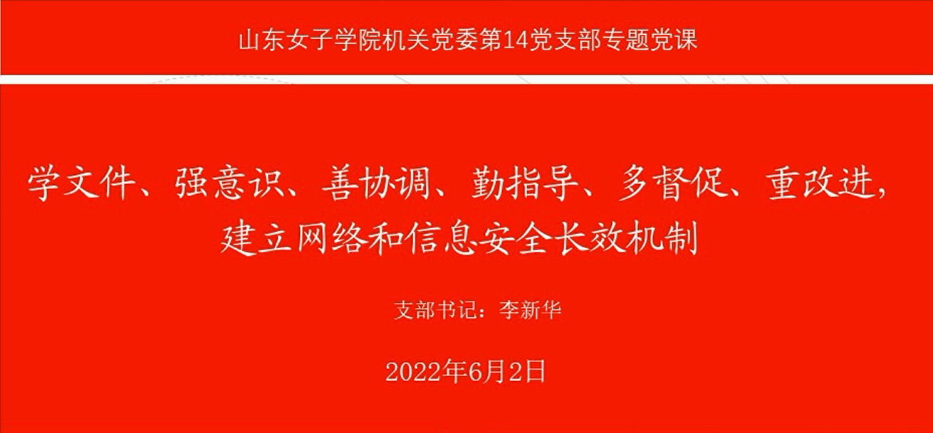 为深入学习贯彻习近平新时代中国特色社会主义思想,认真贯彻《中国共产党党员教育管理工作条例》,6月2日上午,机关党委第十四党支部书记李新华以“学文件、强意识、善协调、勤指导、多督促、重改进,建立网络和信息安全长效机制”为主题,为全体党员同志上了一堂精彩的党课。