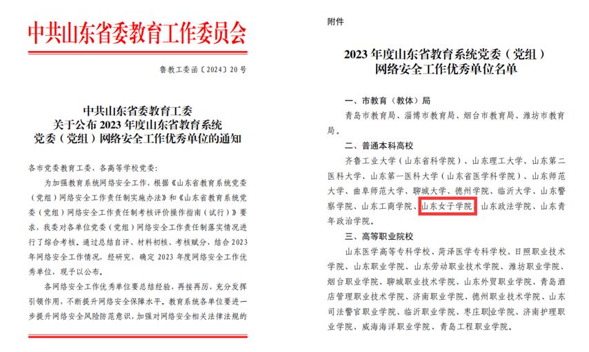 近日,中共山东省委教育工委印发《关于公布2023年度山东省教育系党委(党组)网络安全工作优秀单位的通知》(鲁教工委函〔2024〕20号),学校获评2023年度山东省教育系统党委(党组)网络安全工作优秀单位。