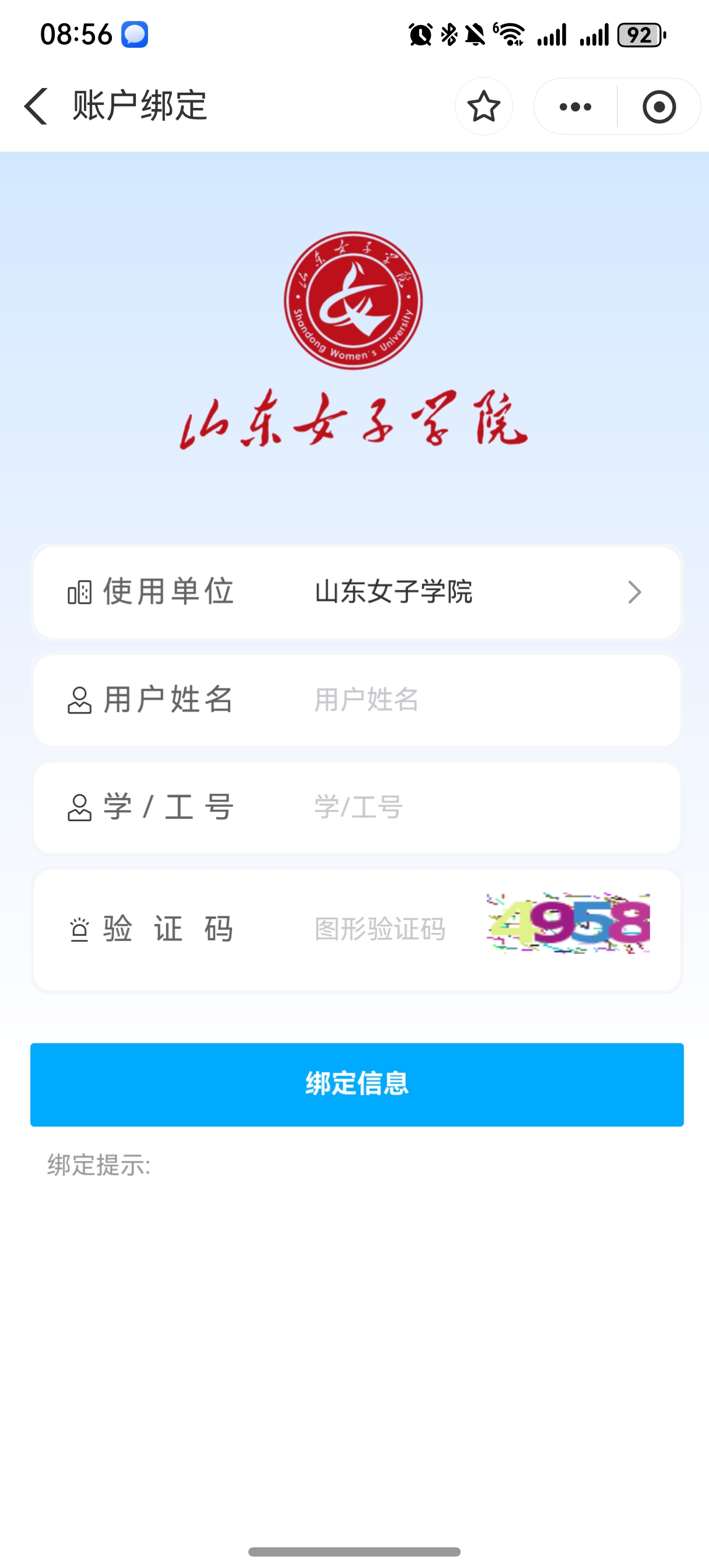 2、点击“同意”向支付宝小程序“山东女子学院一卡通”授权;选择使用单位“山东女子学院”,填写姓名、学号、验证码,点击“绑定信息”