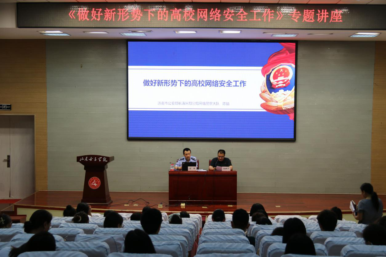 为贯彻落实习近平总书记在全国网络安全和信息化工作会议上“深入开展网络安全知识技能宣传普及,提高广大人民群众网络安全意识和防护技能”的重要讲话精神,进一步提高师生网络安全意识,做好网络安全工作,6月23日下午,学校在图书馆一楼报告厅举办网络安全专题讲座,邀请济南市公安局长清区分局网络警察大队副大队长陈锴作题为《做好新形势下的高校网络安全工作》的专题报告。报告会由网络信息中心负责人主持,学校各部门、单位安全员,全体辅导员、学生安全志愿者和网络信息中心全体人员共120余人聆听报告。